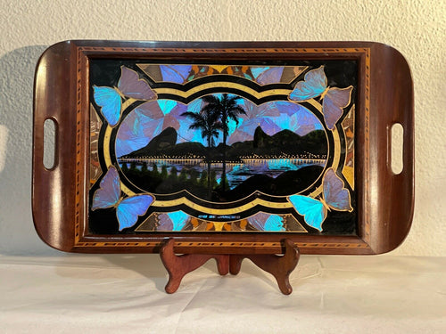 Vassoio vintage in tek pesante intarsiato e vetro